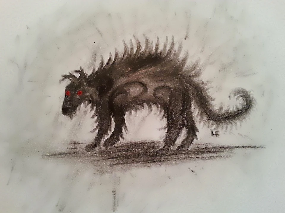 - “It was larger than I was. Solid black, it's fur felt greasy to the touch. It's eyes were black orbs surrounded by whites so bloodshot they looked red. It bit my face, scoring two lines under my eyes. That was it's mark on me.”